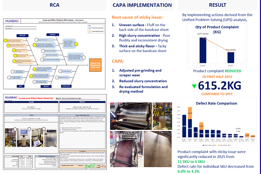 质量提升的成效,最终要靠实实在在的成果来检验。印尼华宝针对长期困扰生产的粘连问题,引入统一问题解决系统(UPS),经过持续攻坚,成功攻克这一生产难题。2025 年相关问题案例较上年同期显著减少。这一突破不仅切实解决了生产痛点,更印证了 “严谨问题解决能力 + 卓越技术执行” 的组合效能,充分说明科学的管理方法与过硬的技术实力相结合,能够有效转化为企业发展的核心竞争力。