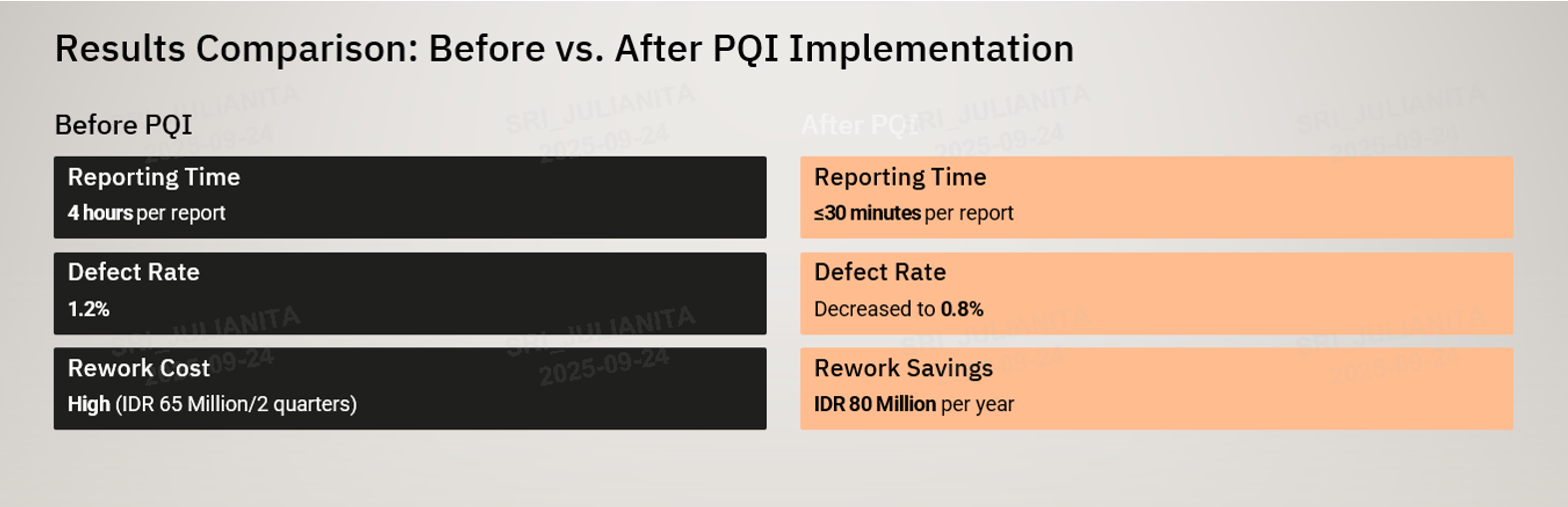 在质量月推出的诸多举措中,过程质量指数(PQI)的实施与应用,成为 印尼华宝“思维转变” 理念落地的典型实践。质量团队以 PDCA 循环(规划、测试、检查、标准化)为科学方法论,历经多轮打磨,构建起一套覆盖全流程、科学高效的质量管控体系:通过建立涵盖平均值、标准差、Cp、Cpk、PPM 等指标的综合 PQI 模型,实现质量数据的全面覆盖与精准监测;引入红、黄、绿(RAG)阈值机制,让工艺状态一目了然,大幅提升质量问题的响应效率;上线自动化仪表板,将 PQI 报告生成时间从 8 小时压缩至 2 小时以内,显著提升工作效率与数据时效性。